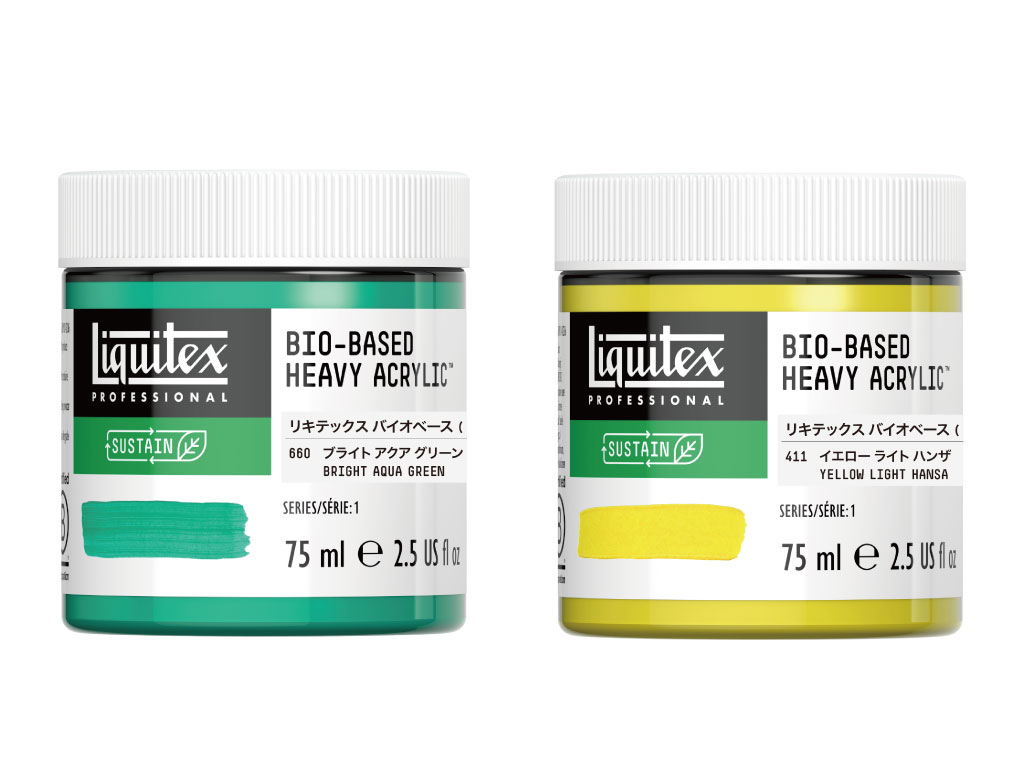 通常アクリル絵具の樹脂ベースは100%石油ベースのアクリルから作られていますが、リキテックス バイオベースはこれを半減し、再生可能な植物由来の成分(トウモロコシ、大豆、サトウキビ、藻類など)に置き換えました。また樹脂だけでなく、バイオベースの成分で代替可能な他の全ての成分が置き換えられており、動物由来の成分や顔料を使用することを避けています。