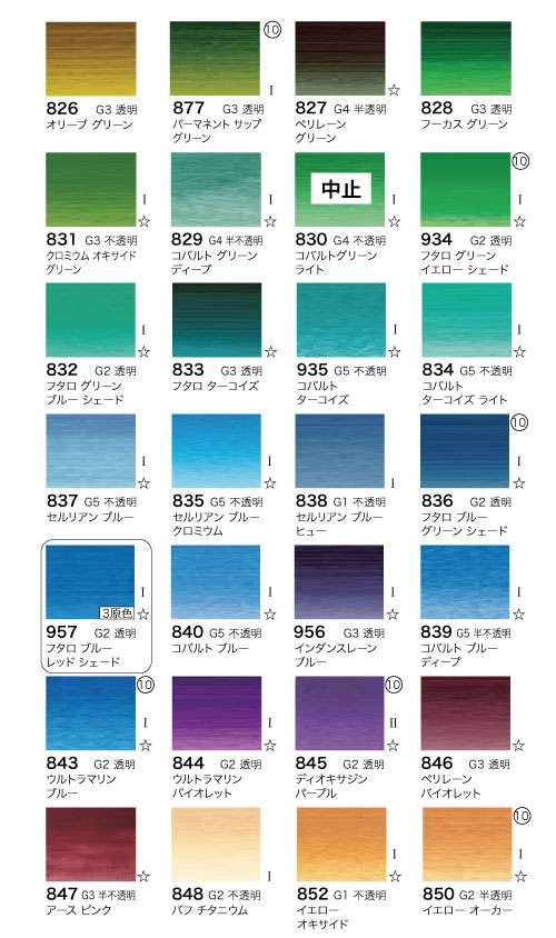 単一顔料で作られた色が全79色中67色(全体の85%) もあります。